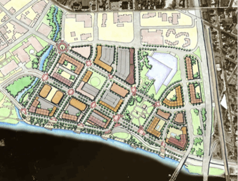 Illustrative Master Plan with conceptual building footprints and street alignments from 2009 Feasibility Assessment – Preferred Alternative (Dewberry Companies Inc, 2009)